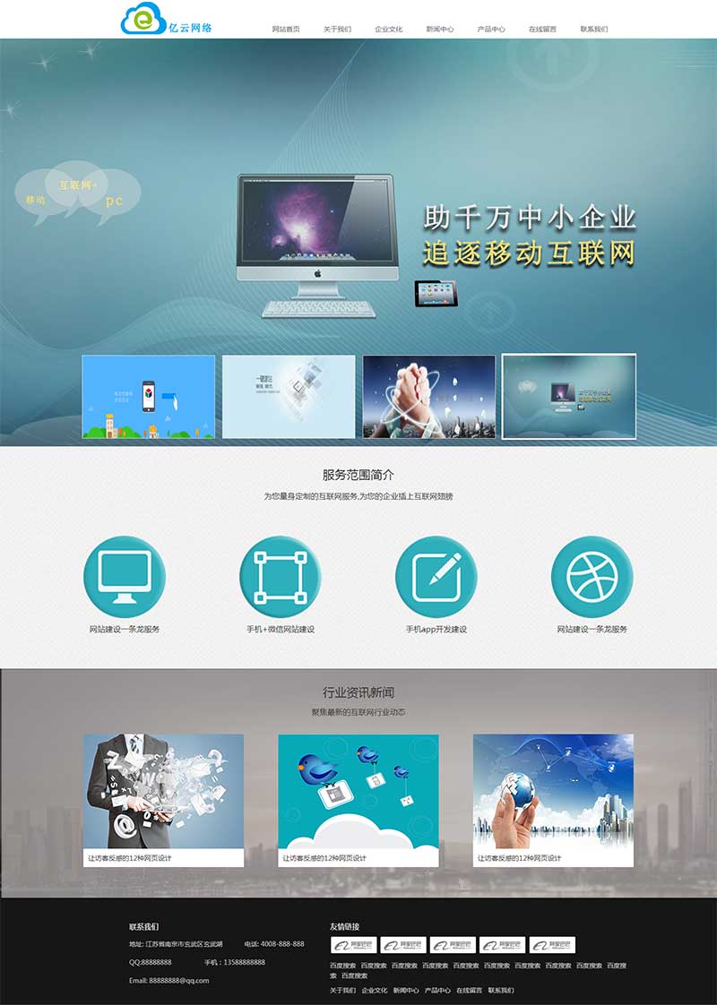 简单通用的互联网品牌建站服务公司网页模板html下载。主要有:关于我们、企业文化、新闻中心、产品中心、在线留言、联系我们等总共8个页面。