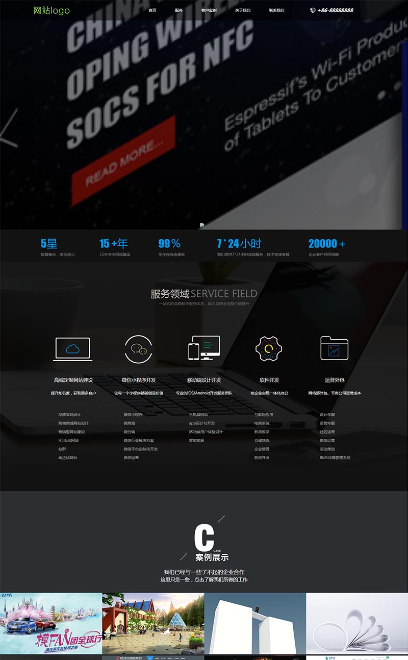 大气的互联网建站服务公司官网模板。适用于:高端定制网站建设、微信小程序开发、移动端设计开发、软件开发、运营外包类型网站。主要有:服务、客户、案例、关于我们、联系我们等7个html页面。