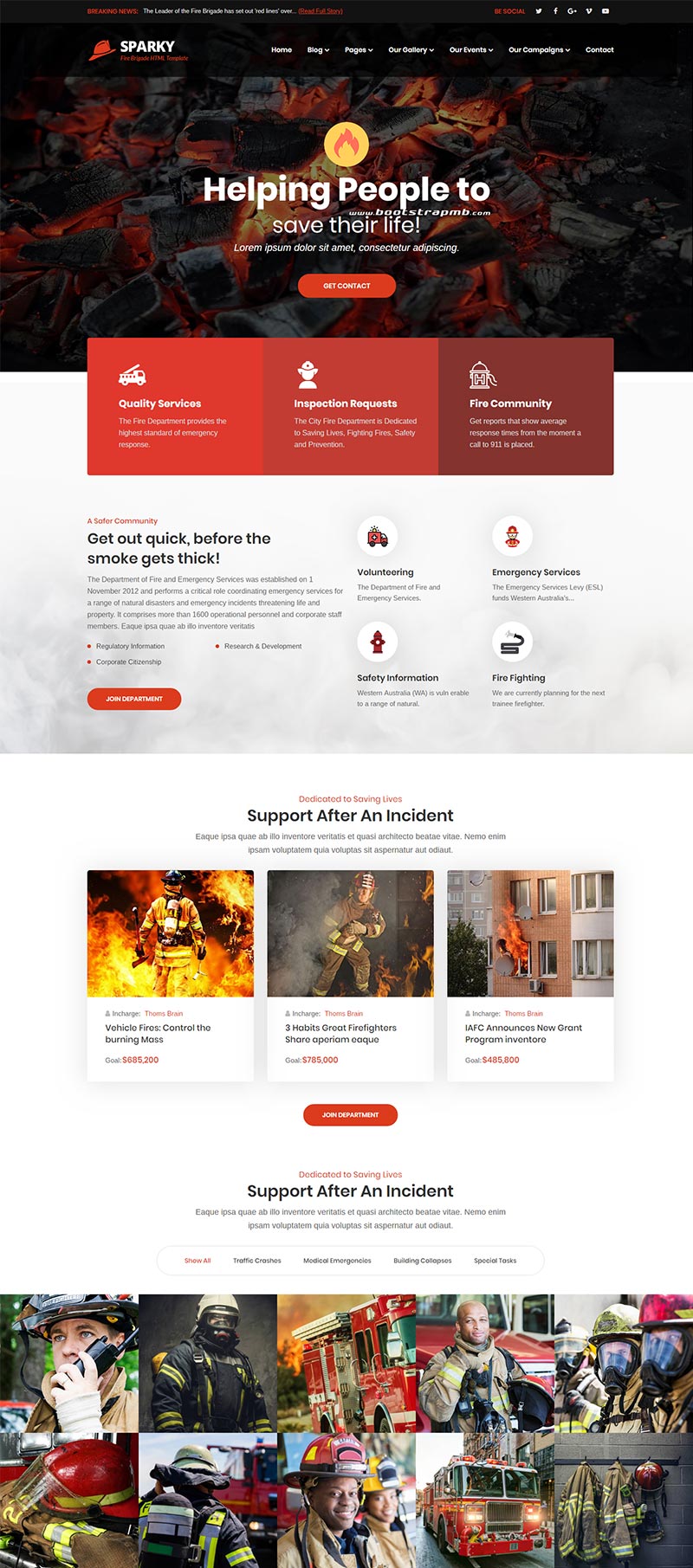一套红色大气的消防知识和火灾救援服务HTML模板,专门为消防网站设计Bootstrap模板。展示救援和消防在线服务。你也可以提供紧急医疗服务、火灾调查,和特殊任务操作消防力量。