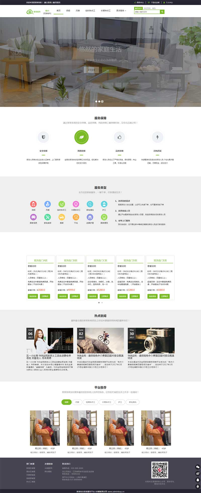 一款绿色响应式的家政服务,家装接单,保姆月嫂雇佣平台网站模板。适用于:临时钟点工、长期钟点工、家电清洗、干洗、搬家、护工、居家保养、皮具护理、居家便民、家电维修等家政行业网站html模板。