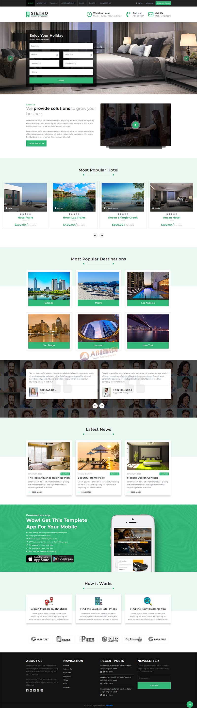 一款绿色的酒店预订、汽车旅馆、度假村、房间预订、旅行房间预订网站响应式模板。所有文件和代码都经过了良好的组织和良好的注释,以便于为您的新创建进行自定义修改。