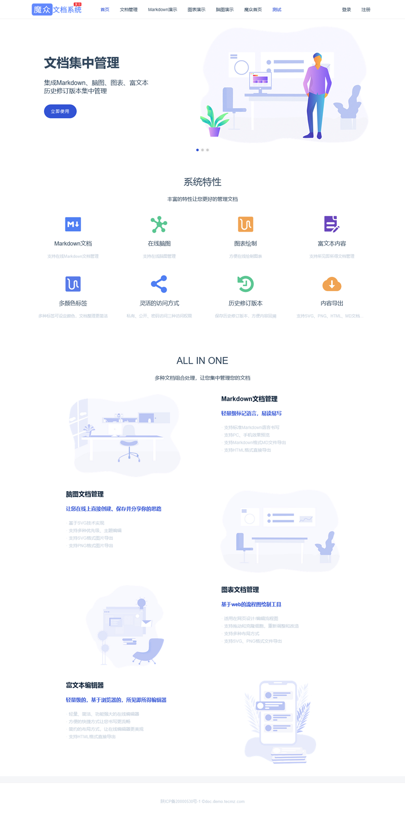 魔众文档管理支持Markdown、图表、脑图、富文本,功能全面、安全稳定,支持标签、分类,可以更好的在线管理个人文档。