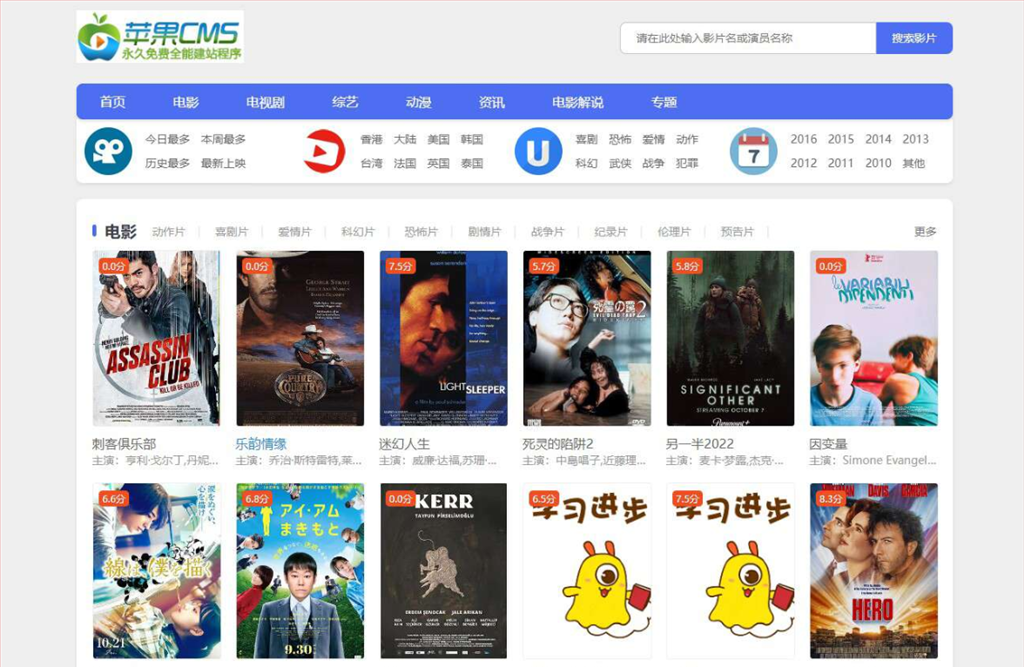 蓝色简约响应式小鸟影视主题是一款好看的影视主题,适用于苹果cmsV10版本,双端自适应