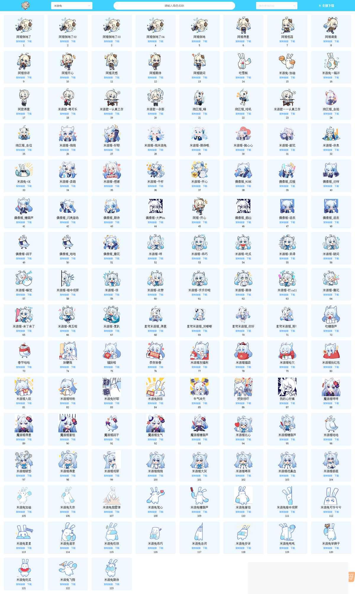 米游社表情包整合网站源码,来自Github大佬的项目,包含米游兔123枚,米游社 玩家12枚,崩坏 星穹铁道112枚,绝区零218枚,NAP32枚,崩坏RPG62枚,崩坏3-1282枚,原神 V官方663枚,未定 官方199枚,原神 V玩家35枚,崩坏3-2146枚,崩坏2 玩家31枚,崩坏学园2,支持复制表情包链接或保存。