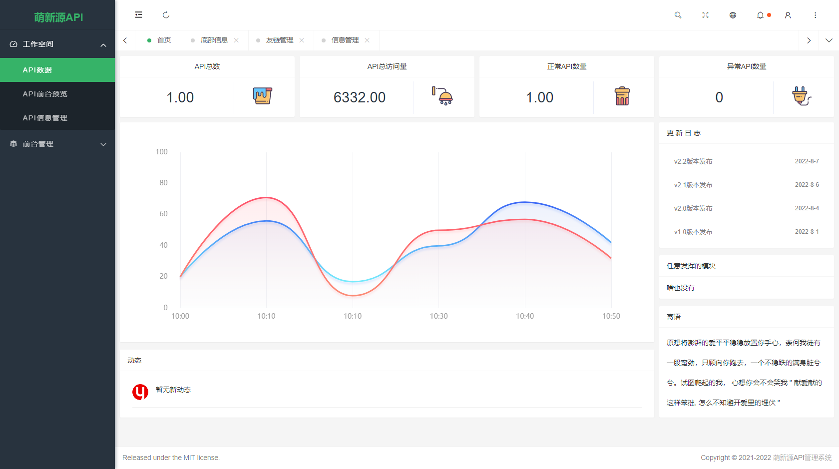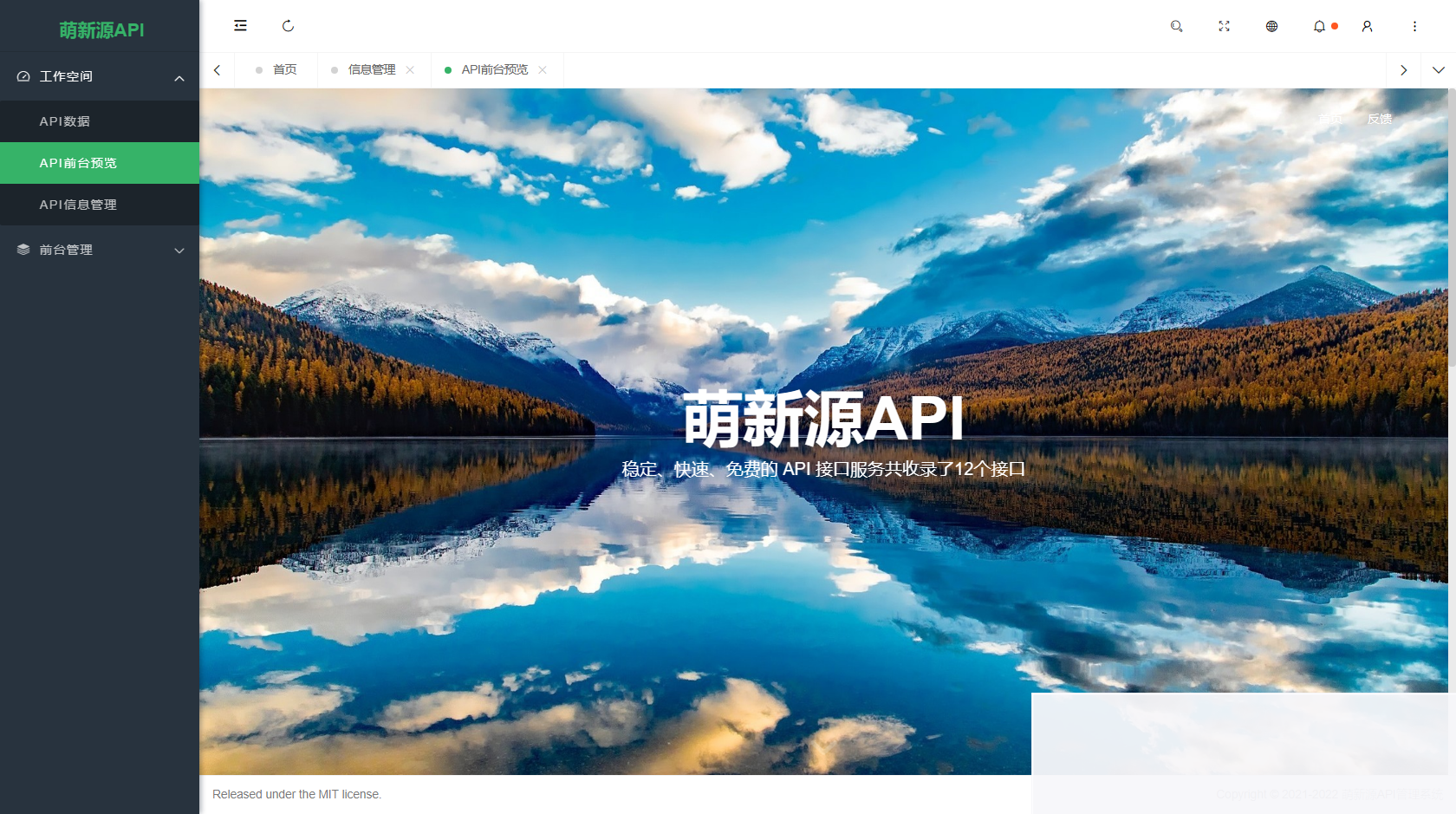 萌新源API管理系统是一款基于layui和pear-Admin-layui前端框架,以及国产ThinkPHP后端框架开发的API管理后台系统。该系统的运行环境要求 PHP7.3以上版本,数据库支持MySQL。