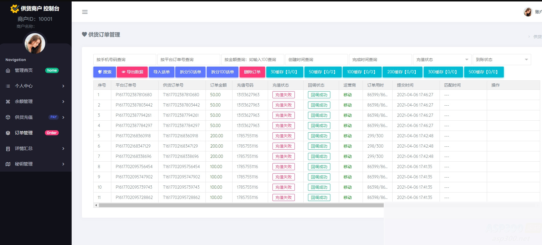 ④、自动检测号码是否已经完成充值返回官方订单号凭证给供应商反馈充值状态