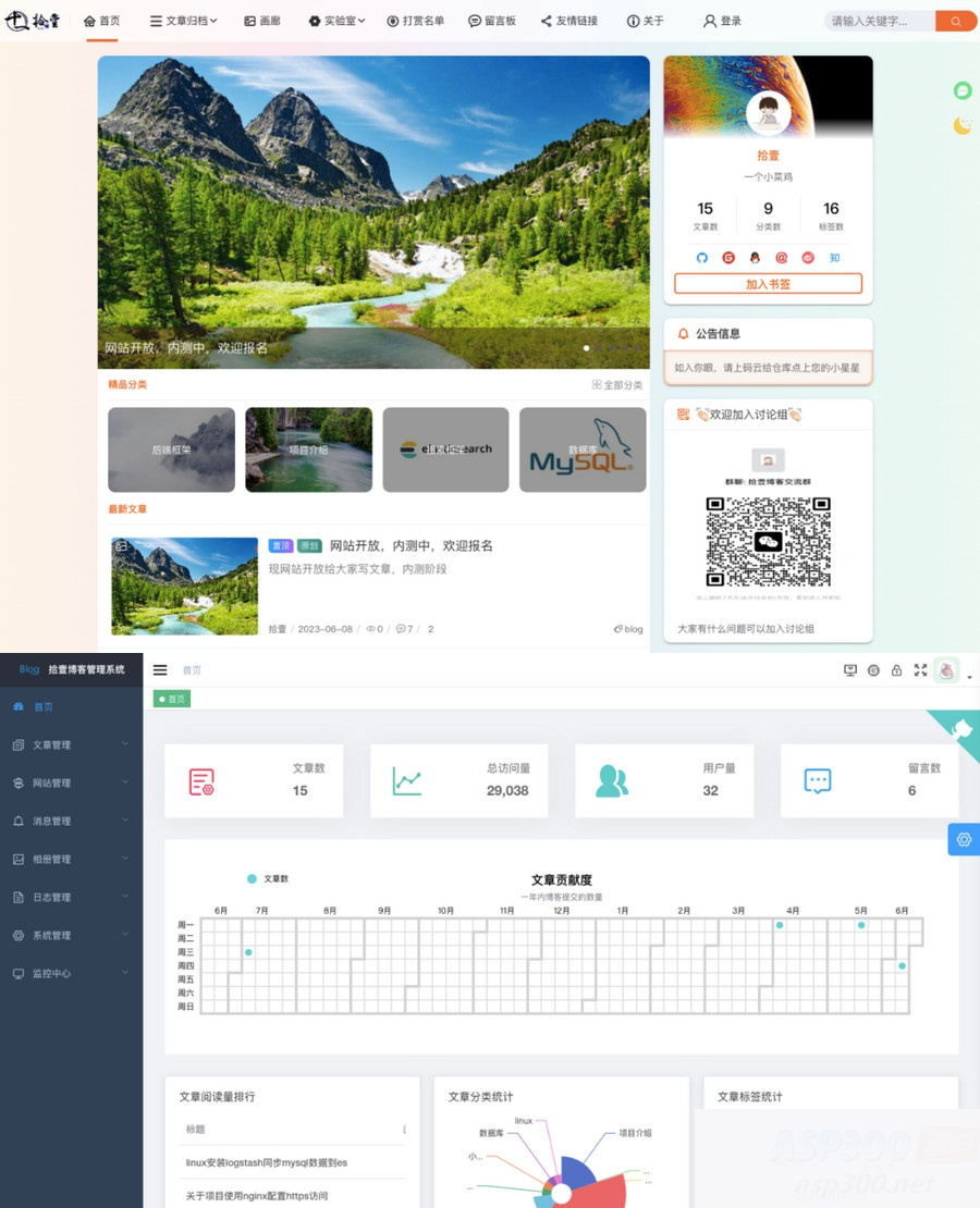 一款简洁、精美、炫酷、带前段小程序源码高体验感博客源码。vue+springboot前后端分离的博客系统,博客后台管理系统使用了vue+elmentui开发,后端使用Sa-Token进行权限管理,支持动态菜单权限,动态定时任务,文件支持本地和七牛云上传,使用ElasticSearch作为全文检索服务,支持QQ、微博、码云登录。