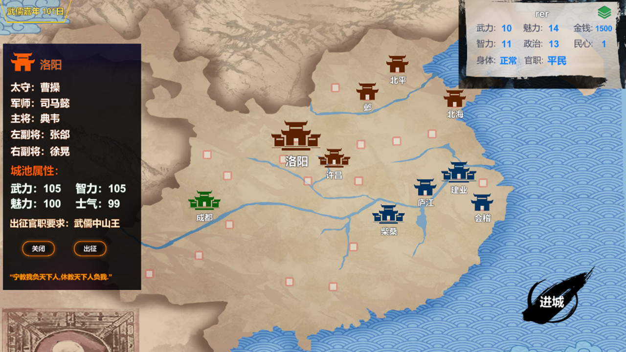 点击外出按钮后,呈现在玩家面前的是武儒大地图,里面分为魏蜀吴三个势力,每个城池可以点击查看属性。当攻城时上面会有明确的前置官职条件和推荐属性值,所以不能盲目的攻取哦,强大自己才能一统天下。