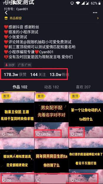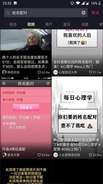 再看看“姓名配对”的视频,播放量很大对吧,我们也进入号主看看。