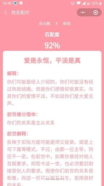 姻缘说出来有点玄,但是姓名配对就不一样了,给人一种更清晰的感觉,直接测姓名合不合。