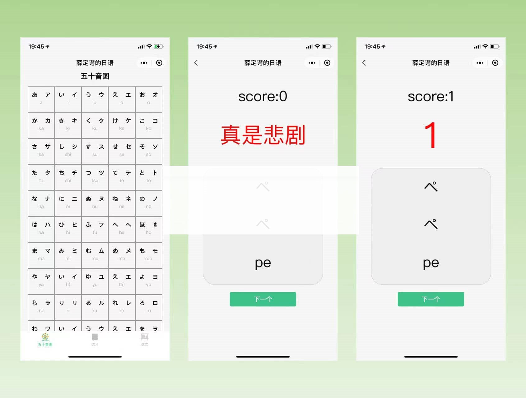 用户回答是否正确,对浊音也对进行单独练习,小程序中包含了多个日语课程,