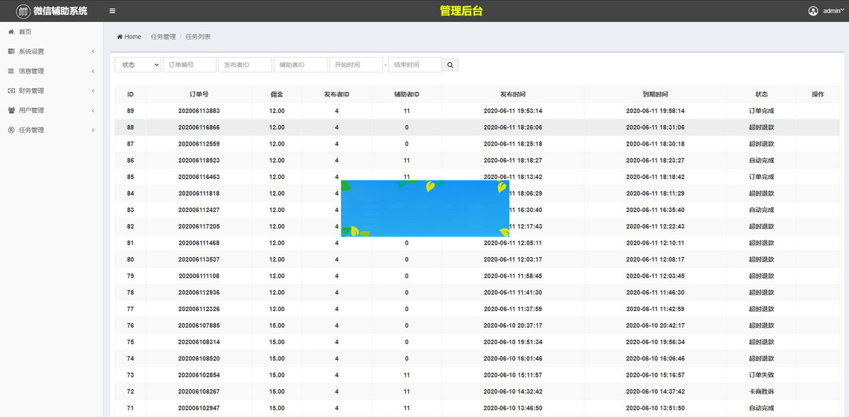 本系统包括:做单端、下单端、总后台三端。结合微信辅助流程,严格定制的一套自动化任务平台。